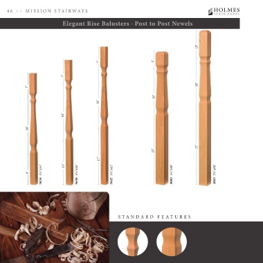 46 >> MISS I O N S T AIR WAY S HOLMES Elegant Rise Balusters · Post to Post Newels 10" 7" 5" 7" 18" 7" 18" 18" 18" 18" 32" 25" 17" "x34" 13" "x38" "x42" "x48" "x60" 9" 1¾ 1¾ 1¾ 3½ 3½ 5634 5638 5642 4060 4065 S T AND ARD FEA TURES