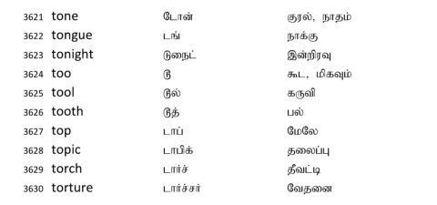 3621 tone Nlhd;; Fuy;> ehjk; 3622 tongue lq; ehf;F 3623 tonight Liel; ,d;wpuT 3624 too ^ $l> kpfTk; 3625 tool ^y; fUtp 3626 tooth ^j; gy; 3627 top lhg;;; NkNy 3628 topic lhgpf; jiyg;G 3629 torch lhHr; jPtl;b 3630 torture lhHr;rH Ntjid