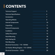 Technical Support 5 Technical Speci cations 6 Introduction 7 Operating Modes 8 Internal Components 10 Unpacking 11 External Components 12 Installation 14 Safety Precautions 15 Panel Mounting 18 Hole Sealing Kit 20 Pole Mounting 22 Electrical Connection - 110 –120VAC 24 Six Position Wiring Diagram - 110 –120VAC 26 Electrical Connection - 12VDC 28