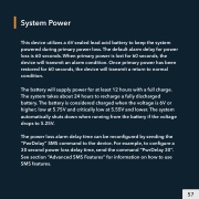 This device utilizes a 6V sealed lead acid battery to keep the system powered during primary power loss. The default alarm delay for power loss is 60 seconds. When primary power is lost for 60 seconds, the device will transmit an alarm condition. Once primary power has been restored for 60 seconds, the device will transmit a return to normal condition.