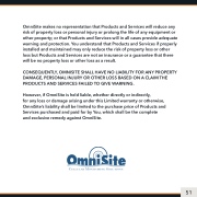 OmniSite makes no representation that Products and Services will reduce any risk of property loss or personal injury or prolong the life of any equipment or other property; or that Products and Services will in all cases provide adequate warning and protection. You understand that Products and Services if properly installed and maintained may only reduce the risk of property loss or other loss but Products and Services are not an insurance or a guarantee that there will be no property loss or other loss as a result.