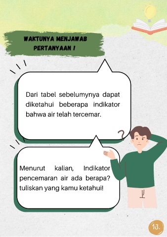 Waktunya menjawab pertanyaan ! Dari tabel sebelumynya dapat diketahui beberapa indikator bahwa air telah tercemar. Menurut kalian, Indikator pencemaran air ada berapa? tuliskan yang kamu ketahui! 13.