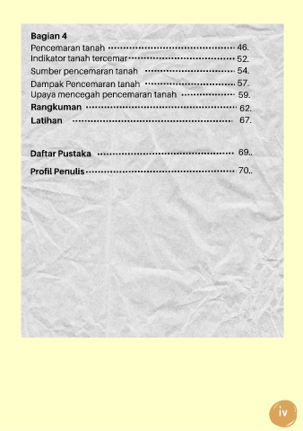 Bagian 4 Pencemaran tanah 46. Indikator tanah tercemar 52. Sumber pencemaran tanah 54. Dampak Pencemaran tanah 57. Upaya mencegah pencemaran tanah 59. Rangkuman 62. Latihan 67. Daftar Pustaka 69.. Profil Penulis 70.. iv