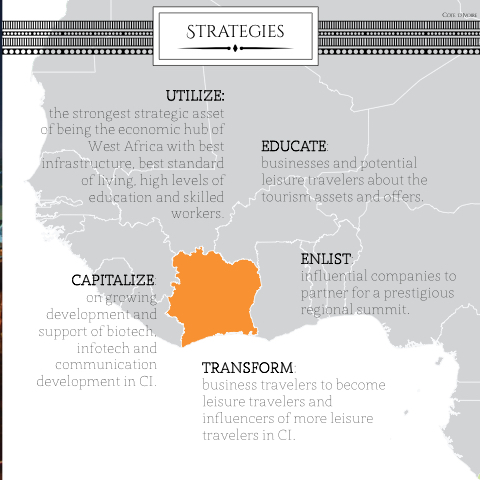 UTILIZE: the strongest strategic asset of of being the economic hub of of West Africa with best infrastructure best standard of of living high levels of of education and skilled workers CAPITALIZE: on growing development and support of biotech infotech and communication development in CI Strategies