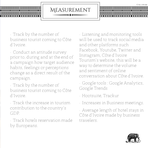 · Track by the number of business tourist coming to to Côte d’Ivoire · Conduct an attitude survey prior to during and at the end of a a a a a campaign how target audience habits feelings or perceptions change as a a a direct result of the campaign · Track by the number of business tourist coming to to Côte d’Ivoire · Track the increase in in tourism contribution to the country’s GDP · Track hotels reservation made by Europeans · Listening and monitoring tools will be used to track social media and other platforms such Facebook Youtube Twitter and Instagram Côte d’Ivoire Tourism’s website this will be a way to determine the volume and sentiment of online conversation about Côte d’Ivoire · Google Google tools : Google Google Analytics Google Trends