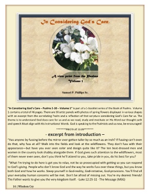 “In Considering God’s Care – Psalms 1-30 – Volume 1” is part of a 5-booklet series of the Book of Psalms. Volume