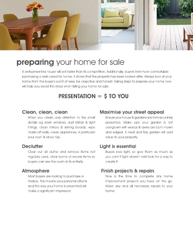 details eg wash windows, dust blinds & light presented. Make sure your garden is not