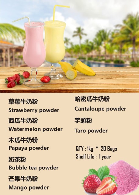 風味沖泡粉 Instant Powder 草莓牛奶粉 哈密瓜牛奶粉 Strawberry powder Cantaloupe powder 西瓜牛奶粉 芋頭粉 Watermelon powder Taro powder 木瓜牛奶粉 Papaya powder QTY : 1kg * 20 Bags 奶茶粉 Shelf Life : 1 year Bubble tea powder 芒果牛奶粉 Mango powder