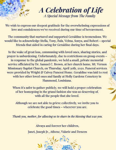 were provided by Wright & Calvey Funeral Home. Geraldine was laid to rest