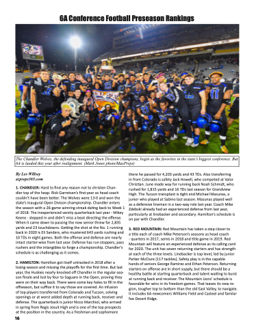 dler top of the heap. Rick Garretsen’s first-year as head coach couldn’t have been better. The Wolves were 13-0 and won the state’s inaugural Open Divison championship. Chandler enters the season with a 26-game winning streak dating back to Week 1 of 2018. The inexperienced varsity quarterback last year - Mikey Keene - stepped in and didn’t miss a beat directing the offense. When it came down to passing the now senior threw for 2,835 yards and 23 touchdowns. Getting the shot at the No. 1 running back in 2020 is Eli Sanders, who mustered 643 yards rushing and 10 TDs in eight games. Both the offense and defense are nearly intact starter-wise from last year. Defense has run stoppers, pass rushers and the intangibles to forge a championship. Chandler’s schedule is as challenging as it comes.