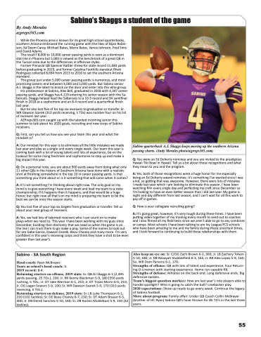 His predecessor at Sabino, Alex Bell, graduated in 2018 with 4,347 career passing yards, and Skaggs has 4,119 entering his senior season with the Sa- bercats. Skaggs helped lead the Sabercats to a 10-3 record and 3A semifinal finish in 2018 as a sophomore and an 8-4 record and a quarterfinal finish last year.