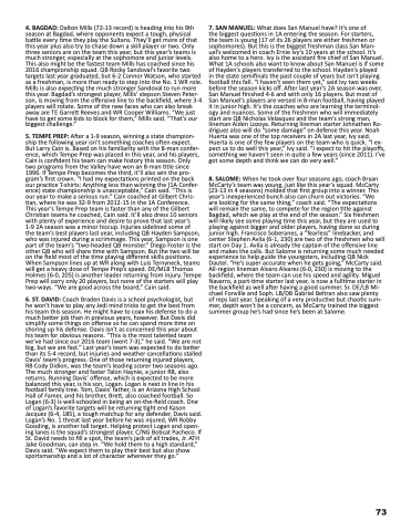 8. SALOME: When he took over four seasons ago, coach Bryan McCarty’s team was young, just like this year’s squad. McCarty (23-13 in 4 seasons) molded that first group into a winner. This year’s inexperienced bunch also can churn out victories. “We are looking for the same thing,” coach said. “The expectations will remain the same, to compete for the region title against Bagdad, which we play at the end of the season.” Six freshmen will likely see some playing time this year, but they are used to playing against bigger and older players, having done so during junior high. Francisco Soberanes, a “fearless” linebacker, and center Stephen Avila (6-1, 230) are two of the freshmen who will start on Day 1. Avila is already the captain of the offensive line and makes the calls. But Salome is returning some much needed experience to help guide the youngsters, including QB Nick Dautel. “He’s super accurate when he gets going,” McCarty said. All-region lineman Alvaro Alvarez (6-0, 230) is moving to the backfield, where the team can use his speed and agility. Miguel Navarro, a part-time starter last year, is now a fulltime starter in the backfield as well after having a good summer. Sr. DE/LB Mi- chael Fonville and Soph. LB/DB Gabriel Beltran also saw plenty of reps last year. Speaking of a very productive but chaotic sum- mer, depth won’t be a concern, as McCarty trained the biggest summer group he’s had since he’s been at Salome.