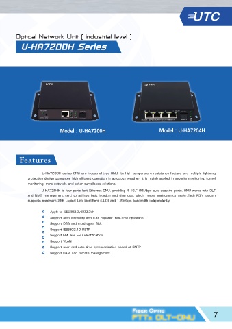U-HA7200H series ONU are industrial type ONU. Its high temperature resistance feature and multiple lightning