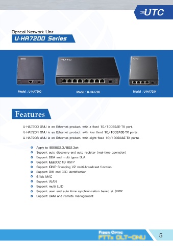 U-HA7200 ONU is an Ethernet product, with a fixed 10/100BASE-TX port.