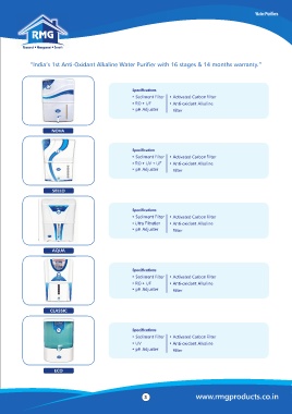 Water Purifiers Water Purifiers RMG Research • Management • Growth “India’s 1st Anti-Oxidant Alkaline Water Purifier with 16 stages & 14 months warranty.” RO + UF NOVA RO + UV + UF SELLO Ultra Filtration AQUA RO + UF CLASSIC UV ECO 3 3
