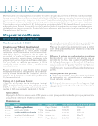 Morena cuenta con dos propuestas a considerar en materia de justicia. La primera se refiere a modificaciones de forma y fondo a la Suprema Corte de Justicia de la Nación (SCJN) y la segunda trata sobre las características defi- nitorias para la procuración de justicia de la nueva Fiscalía General de la República. En el caso de la SCJN, Morena busca involucrar a la academia, gremios profesionistas y a sociedad civil con el fin de mejorar tres áreas: Consejo de la Judicatura Federal (CJF), la designación de ministros de la SCJN y la posibilidad de crear un tribu- nal constitucional. En tanto, busca atribuirle a la Fiscalía facultades de investigación con mayor amplitud en mate- ria de lavado de dinero y corrupción. Por otro lado, busca reformar el artículo constitucional que designa al Fiscal General a través del Ejecutivo.