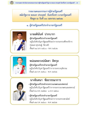 รายงานผลการด าเนินงานของคณะกรรมการผู้ช่วยรัฐมนตรี รัฐบาล พลเอก ประยุทธ์ จันทร์โอชา นายกรัฐมนตรี : 5 รายนามคณะกรรมการผู้ช่วยรัฐมนตรี สมัยรัฐบาล พลเอก ประยุทธ์ จันทร์โอชา นายกรัฐมนตรี ข้อมูล ณ วันที่ ๓๐ เมษายน ๒๕๖๒ ๑. ผู้ช่วยรัฐมนตรีประจ านายกรัฐมนตรี