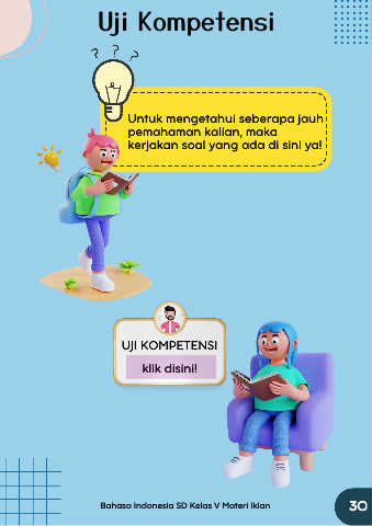 Uji Kompetensi Untuk mengetahui seberapa jauh pemahaman kalian, maka kerjakan soal yang ada di sini ya! UJI KOMPETENSI klik disini! Bahasa Indonesia SD Kelas V Materi Iklan 30