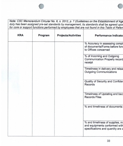 N o te: CSC M em orandum C ircula r No. 6, s. 2012, p. 7 (G uidelines on the E stablishm ent o f A g e n cy SPM S) p rovides that, “U nless the work o utp ut o f a particular