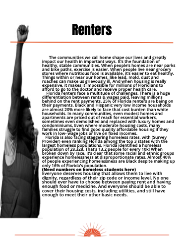 Florida renters face a multitude of challenges. There is a huge differentiation between rents & wages paid, leaving millions behind on the rent payments. 25% of Florida renters are being on their payments. Black and Hispanic very low income households are almost 20% more likely to face that cost burden than white households. In many communities, even modest homes and apartments are priced out of reach for essential workers, sometimes even demolished and replaced with luxury homes and condominiums. Even where moderate housing costs, many families struggle to find good quality affordable housing if they work in low- wage jobs or live on fixed incomes.