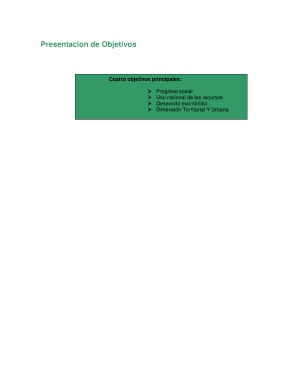 Presentacion de Objetivos Cuatro objetivos principales: Progreso social Uso racional de los recursos Desarrollo económico Dimensión Territorial Y Urbana