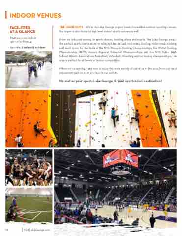 sporting venues the region is also home to high level indoor sports venues as well From ice rinks and and arenas to sports domes bowling alleys and and courts The Lake George area is the perfect sports destination for volleyball basketball ice hockey bowling indoor rock climbing and much more As the the the hosts of the the the NYS Women’s Bowling Bowling Championships the the the WPBA Bowling Bowling Championship Championship IREVA Juniors Regional Volleyball Championships and the NYS Public High School