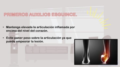• Mantenga elevada la articulación inflamada por encima del nivel del corazón. • Evite poner peso sobre la articulación ya que puede empeorar la lesión.