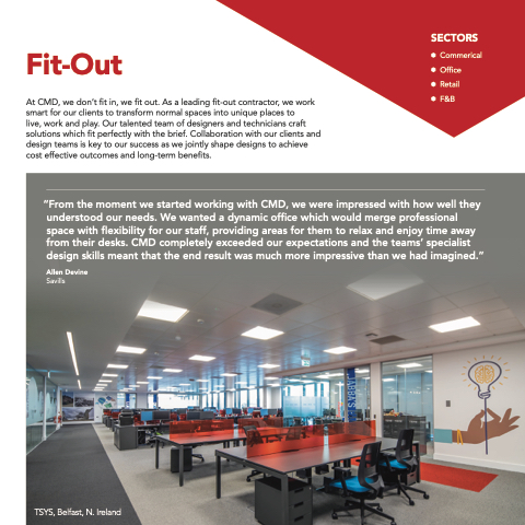At CMD we we we don’t fit fit fit in in in we we we fit fit fit out out As a a a a a a a a leading fit-out contractor we we we work smart for for our clients to to to to transform normal spaces into unique places to to to to live work and and play Our talented team of designers and and technicians craft solutions which fit perfectly with with the brief Collaboration with with our our clients and and and design design teams is key to to our our success as we jointly shape designs to to achieve cost effective outcomes and long-term benefits SECTORS