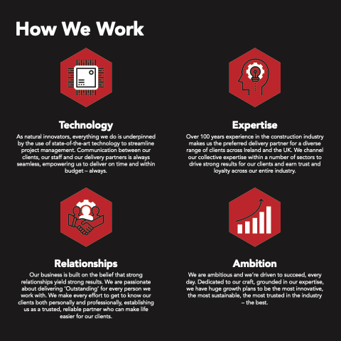 Over 100 years experience in in the the construction industry makes us us the the the preferred delivery partner for a a a a a a a a a diverse range of of clients across Ireland and and the the UK We channel our our collective expertise within a a a a a a a a a number of of sectors to to drive strong results for our our our clients and and earn trust and and loyalty across our our entire industry Relationships