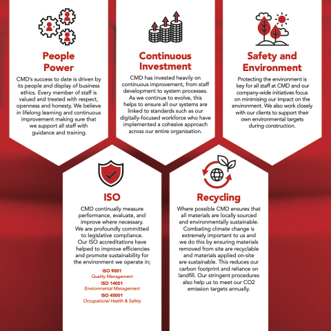 Where possible CMD ensures that all all all materials are locally sourced and environmentally sustainable Combating climate change is extremely important to us and we do this by ensuring materials removed from site site are recyclable and materials applied on-site are sustainable This reduces our carbon footprint and and reliance on on landfill Our stringent procedures also help us to meet our CO2 emission targets annually CMD continually measure performance evaluate and improve where necessary We are profoundly committed to legislative compliance Our ISO