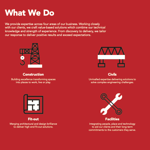 We provide expertise across four areas of our our our our business Working closely with our our our our clients we we craft value-based solutions which combine our our our our technical knowledge and and strength of experience From discovery to to delivery we we tailor our response to to deliver deliver positive results and and exceed expectations Construction