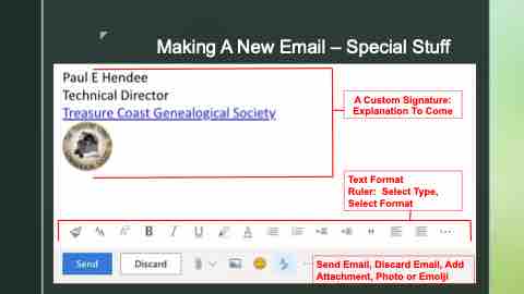 z Making A New Email – Special Stuff A Custom Signature: Explanation To Come Text Format Ruler: Select Type, Select Format Send Email, Discard Email, Add Attachment, Photo or Emolji