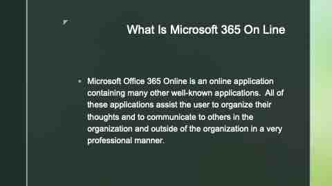 ยง Microsoft Office 365 Online is an online application containing many other well-known applications. All of these applications assist the user to organize their thoughts and to communicate to others in the organization and outside of the organization in a very professional manner.