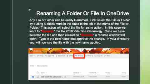 Any File or Folder can be easily Renamed. First select the File or Folder by putting a check mark in the circle to the left of the name of the File or Folder. This action will select the file for some action. In this case we want to "Rename" the file 2019 Valentine Genealogy. Once we have selected the file and then clicked on "Rename" a rename window will open. Type in the new name and approve the change. In your directory you will now see the file with the new name applied.