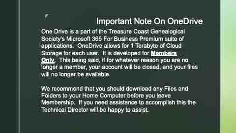 One Drive is a part of the Treasure Coast Genealogical Society's Microsoft 365 For Business Premium suite of applications. OneDrive allows for 1 Terabyte of Cloud Storage for each user. It is developed for Members