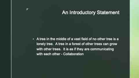 z An Introductory Statement ยง A tree in the middle of a vast field of no other tree is a lonely tree. A tree in a forest of other trees can grow with other trees. It is as if they are communicating with each other - Collaboration