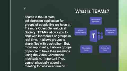 Teams is the ultimate collaboration application for groups of people like we have at Treasure Coast Genealogical Society. TEAMs allows you to chat with individuals or groups in real time. It allows groups to share files with each other. But, most importantly, it allows groups of people to have their meetings using the Video Conference mechanism. Important if you cannot physically attend a meeting for whatever reason.