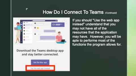 z How Do I Connect To Teams (Continued) If you should "Use the web app instead" understand that you may not have all of the resources that the application may have. However, you will be aple to performe most of the functions the program allows for.