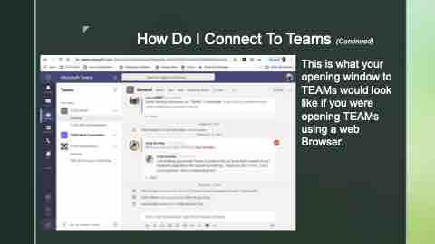 z How Do I Connect To Teams (Continued) This is what your opening window to TEAMs would look like if you were opening TEAMs using a web Browser.