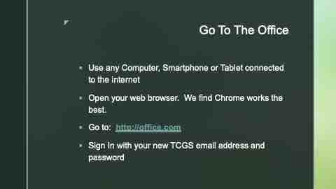 z Go To The Office § Use any Computer, Smartphone or Tablet connected to the internet § Open your web browser. We find Chrome works the best. § Go to: http://office.com § Sign In with your new TCGS email address and password