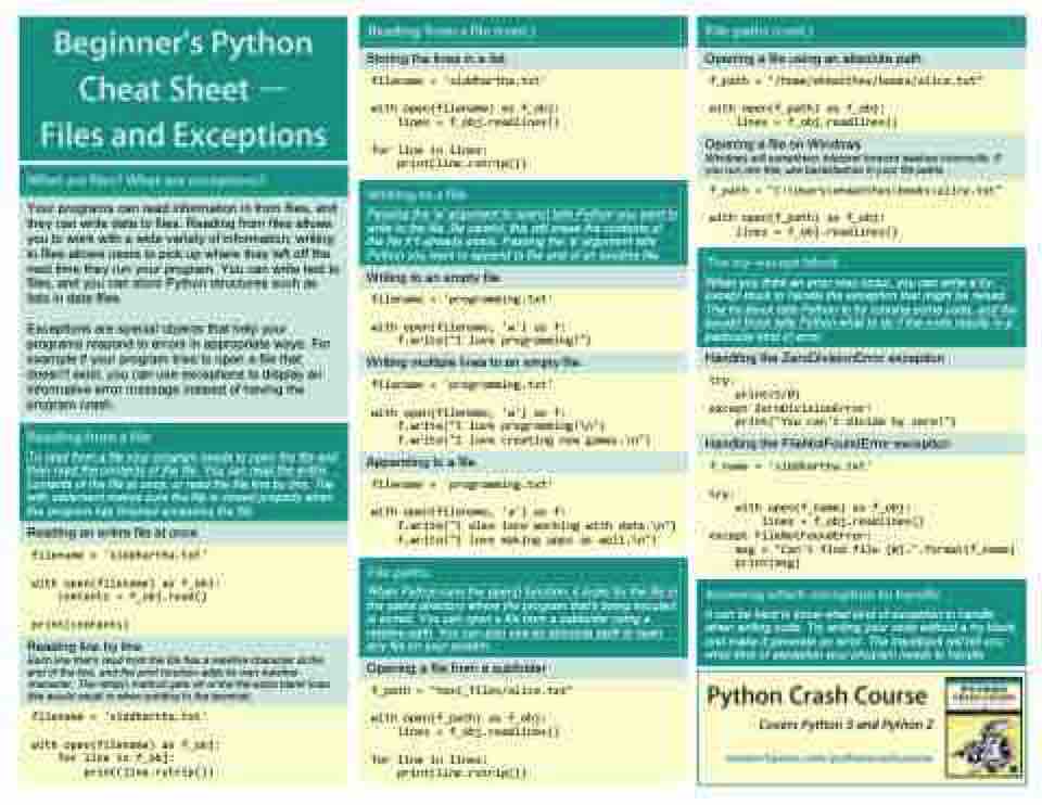 Your programs can read information in from files, and they can write data to files. Reading from files allows you to work with a wide variety of information; writing to files allows users to pick up where they left off the next time they run your program. You can write text to files, and you can store Python structures such as lists in data files.