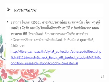 • อรรถกร ใจเดช. (2555). การพัฒนาการคิดทางเรขาคณิต เรื่อง ทฤษฎี