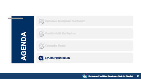 1 Lini Masa Kebijakan Kurikulum AGENDA 3 Kerangka Dasar 2 Karakteristik Kurikulum Struktur Kurikulum 4 Kementerian Pendidikan, Kebudayaan, Riset, dan Teknologi 31 Kementerian Pendidikan, Kebudayaan, Riset, dan Teknologi