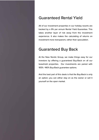 At the New Nordic Group, we make things easy for our investors by offering a guaranteed Buy-Back on all our leasehold properties. Our investments are paired with 105% -140% Buy-Back guarantee options.