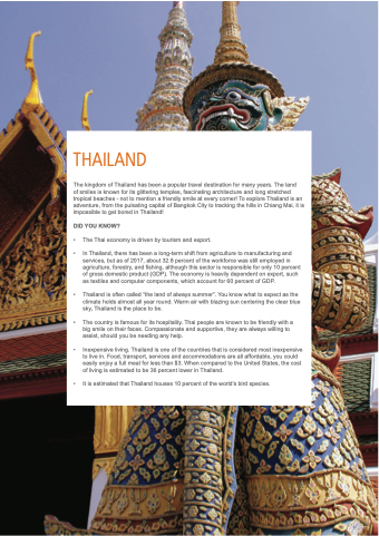 • The Thai economy is is driven by tourism and export • In Thailand there has been a a a a a a a a a a a long-term shift from agriculture to manufacturing and and services but as as as of of 2017 about 32 8 percent percent of of the the workforce was still employed in in in agriculture forestry and fishing although this sector fis is is is responsible for for for only 10 percent percent of of gross domestic product (GDP) The economy fis is is is heavily dependent on on on on on export such as textiles and computer components which account for 60 percent of of GDP GDP • Thailand is often called “the land land of of always summer” You know what to expect as the the the climate holds almost all all year round Warm air with blazing sun centering the the the the clear blue sky Thailand is the place to be • The country is famous for its hospitality Thai people are are known to to be friendly with a a a a a a a a a a a a big smile on on their faces Compassionate and supportive they are are always willing to to assist should you be needing any help • Inexpensive living Thailand is is one of the countries that is is considered most inexpensive to to live in in in Food transport services and and accommodations are are all affordable you could easily enjoy a a a a a a a a a a a a a a a a a full meal for for less than $3 When compared to to to the the United States the the cost of living is estimated to be 36 percent lower in in Thailand • It is estimated that Thailand houses 10 percent of the world’s bird species 16