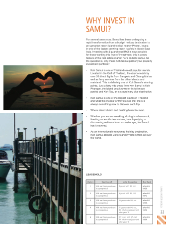 • Koh Samui is is one of of Thailand’s most popular islands Located in the Gulf of of Thailand Thailand it’s easy to reach by over 20 direct flights from from Bangkok and and and and Chiang Mai as as as well as ferry services from from the the other islands and and and and mainland This is is is is definitely one of Koh Koh Koh Samui’s winning points Just a a a a a a a a a a ferry ride away from Koh Koh Koh Samui Samui is is is is Koh Koh Koh Phangan the island best known for its full moon parties and and Koh Tao an an an an an extraordinary dive destination • Koh Samui is is is is is one of the the largest islands in Thailand and and and what this means for travellers is is is is is is that there is is is is is is always something new to discover each trip • Where island charm and and bustling town life meet • Whether you are sun-seeking dozing in in in in in in a a a a a a a hammock feasting on world-class cuisine beach partying or or discovering wellness in in in in in an exclusive spa Ko Samui has it covered • As an an internationally renowned holiday destination Koh Samui attracts visitors and investors from all all over the world LEASEHOLD