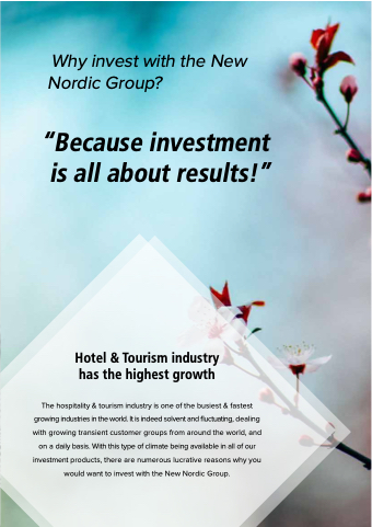 The hospitality & tourism industry is one of the busiest & fastest growing industries in the world. It is indeed solvent and fluctuating, dealing with growing transient customer groups from around the world, and on a daily basis. With this type of climate being available in all of our investment products, there are numerous lucrative reasons why you would want to invest with the New Nordic Group.