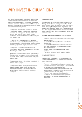 Chumphon Chumphon City is is located 440 km from from Bangkok and Chumphon Chumphon Chumphon airport is is only a a a a a a a 10 minutes’ drive from from Coral Beach Chumphon Chumphon • • • • • • Chumphon is is one of of of the the key areas of of of the the Tourism Authorities of of of Thailand (TAT) to to focus on on on on boosting tourism in in in the coming years Chumphon has also recently been selected as as one of only four key locations to become the the New Thailand Riviera by the the Thai Government As As New Nordic is already being a a a a a a a highly trusted property developer in in in in Thailand and and and Asia in in in in general we ensure security and and and predictability Investing with us is a a a a a a a safe yet profitable way o of placing your money Chumphon is is a a a a a a a hub between North and and and South Thailand with easy access to the islands of Koh Koh Koh Tao Koh Koh Phangan and and Koh Koh Samui It is is far from other “touristified” places in Thailand In Chumphon you can experience the the real untouched Thailand – a a a a a a nice and and quiet environment with yet so much to offer!