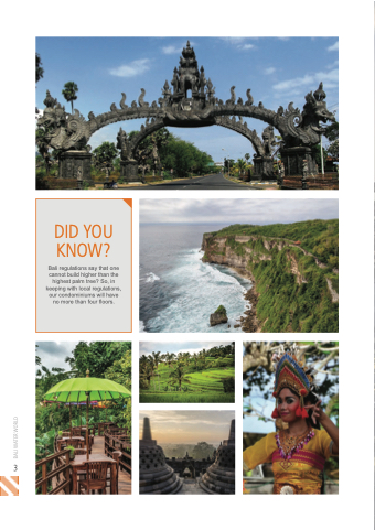 DID YOU KNOW? Bali regulations say that one cannot build higher than the highest palm tree? So in in keeping with local regulations our our condominiums will have no more than four floors 34 BALI WATER WORLD