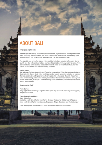 – – daily daily direct direct flights flights from from Jakarta Singapore Tokyo Surabaya and and Kuala Lumpur From the airport to New Nordic – a a a a short taxi drive of maximum 30 minutes BALI